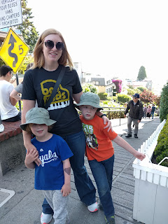 We got pizza for dinner (two nights in a row--hooray for pizza!), then caught the bus back to the cable car stop. And because we weren't sure what our transit options were, we stuck with the cable car. Andrew and kids watched the breakdancers there for awhile and I took line duty. Eventually we got back to our hotel. We had promised the kids ice cream earlier in the day, and since we couldn't find any at Golden Gate Park (during our very limited exploring), Andrew took the kids upstairs since they had to go potty while I went to the market across the street and got little ice cream bars for us all. Also picked up a container of raspberries since I knew Olive would eat them (girl needs nutrition!) and some beer. I was pleasantly surprised to find the store carried not only Boulevard, but perhaps my new favorite Boulevard, the tropical pale ale. We enjoyed our desserts
